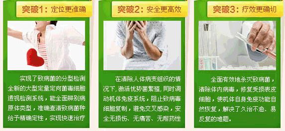 <治疗原理>采用非介入方式,不接触人体,利用生物物理方式达到治疗的目的。通过科学检测和精确诊断,从根本上全效灭菌,全程动态控制,整个治疗过程中几乎不对患者构成损伤和疼痛。具有全面调节、高效安全、不易犯病的特点,是专治泌尿疾病的“绿色疗法”。